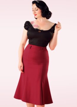 ”Simplicity is the ultimate sophistication”… so true! Deze beauty draag je hoog in de taille, heeft speelse knoopdetails en loopt vanaf de heupen lichtjes uit in een fishtail rok. Als het stijltje nog niet elegant genoeg was, maakt de midi lengte het wel af 😉 Uitgevoerd in een soepel, wijnrood stofje met een hele lichte stretch dat heerlijk draagt. Match met een chique blouse en parels om de look af te maken, classy all the way!   * Recht taillemodel * Vaste knoopdetails * Fishtail detail * Blinde rits en haaksluiting achterzijde * Onze beauty Ava is 1,69 m
