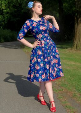 ”When your dress does the talking; soft petals, bold charm, and swingy grace in every step.” Deze swing beauty is exclusief bij Topvintage verkrijgbaar en door onze eigen in-house designers ontworpen. Uitgevoerd in een stevige maar soepel vallende, kobaltblauwe katoenmix met een lichte stretch, voorzien van een unieke, kleurrijke bloemenprint.   * Full swing model * Boothals * 3/4 mouwen * Zijwaartse steekzakken * Combineer met een van onze petticoats voor een extra feestelijk effect * Blinde rits achterzijde * De print is door onze eigen in-house designers ontworpen * Valt bij een lengte van 1,70 m over de knie * Exclusief bij Topvintage verkrijgbaar