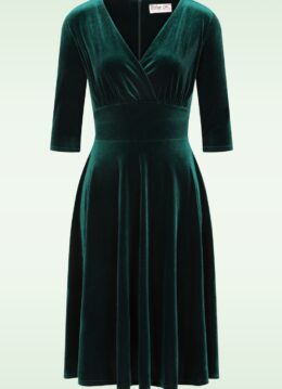 Deze Maddison swing jurk is een droom van een jurk! Deze beauty heeft een elegante geplooide overslag, 3/4 mouwen en een brede tailleband die je taille perfect benadrukt. Vanaf de taille loopt ze uit in een zwierige swing rok waardoor er een super vrouwelijk silhouet ontstaat. Uitgevoerd in een soepele en stretchy, zachte, flessengroene fluwelen stof die heerlijk draagt. “Stop dreaming and start ordering!” * Swing model * Gevoerde top * Vaste geplooide overslag * 3/4 mouwen * Brede tailleband * Blinde rits achterzijde * Exclusief bij Topvintage verkrijgbaar * Valt bij een lengte van 1,70 m over de knie