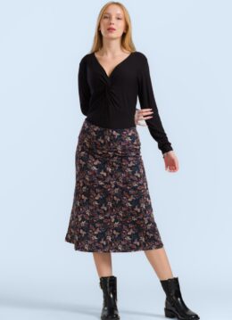 ”Autumn wardrobe staple!” Claudia is uitgevoerd in een soepele en stretchy, donkerblauwe bio katoenmix voorzien van een bloemenprintje, die heerlijk comfortabel draagt.   * Elastische tailleband; super comfy * Geen rits of knopen; aantrekken en ready to go! * Valt bij een lengte van 1,70 m net over de knie