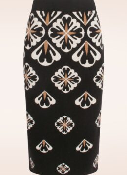”Let’s put on my favourite knitted skirt!” Deze beauty is uitgevoerd in een zware maar soepele, fijngebreide zwarte stretchy stof voorzien van een grafische bloemenprint en ingewerkte glitterdraad in crème en zand, die heerlijk draagt! * Aansluitende fit * Tailleband voorzien van elastiek * Geen rits of knopen; aantrekken en ready to go! * Valt bij een lengte van 1,70 m halverwege de kuit * De afgebeelde sweater is niet verkrijgbaar in onze shop