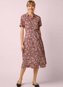 “Buttoned up, blooming bright!” Deze midi doorknoopjurk is speels én vrouwelijk dankzij de top met puntig kraagje, korte mouwen en het afneembare striklint dat je taille prachtig accentueert. Ze is uitgevoerd in een heerlijk soepele, rode EcoVero viscosemix (stretcht niet) en voorzien van een prachtige bloemenprint in crème en zwart — een echte eyecatcher voor elke dag. * Midi model * Doorknoopjurk * Puntig kraagje * Korte mouwen * Afneembare strikband voor een extra ‘snatched’ taille * It has pockets! * Reikt bij een lengte van 1,70 m tot op de kuit