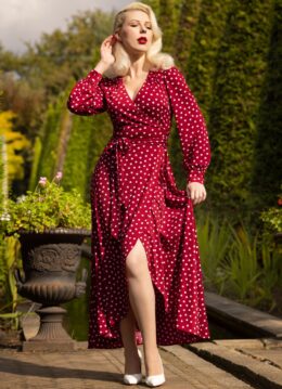 Topvintage exclusive ~ Carina polkadot maxi wikkeljurk in rood en wit