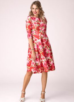 ”A swing of vintage charm in full bloom!” Deze fleurige jurk heeft een boothals halslijn, 3/4 mouwtjes en loopt uit in een flowy swing rok. Ze is uitgevoerd in een soepele en stretchy crêpe achtige stof in rood met prachtige rozenprint in herfstachtige kleuren. * Swing stijl * Boothals halslijn * Gevoerde top voor extra comfort * 3/4 mouwen * Blinde rits achterzijde * Valt over de knie bij een lengte van 1,70 m * Exclusief bij Topvintage verkrijgbaar * Melissa is 1,78 m