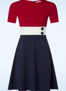 ”Life is short.. buy the dress!” Deze vintage geïnspireerde beauty heeft een hoge ronde halslijn, korte mouwtjes, decoratieve knoopjes aan de voorzijde en loopt vanaf de taille uit in een semi-swing rok. Ze is uitgevoerd in een stevige maar soepele en stretchy, crêpe achtige stof in de kleuren rood, wit en blauw, die heerlijk comfortabel draagt.    * Semi-swing model * Ronde halslijn * Korte mouwen * Decoratieve knopen voorzijde  * Blinde rits achterzijde * Exclusief bij Topvintage verkrijgbaar * Reikt bij een lengte van 1,70 m net boven de knie