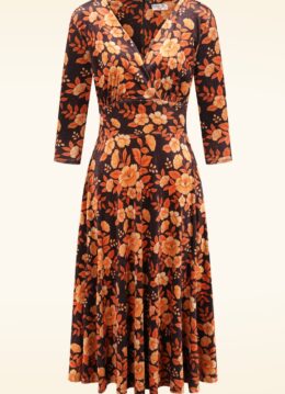 “Orange blossoms, black velvet, and all the fall feels.” Deze vintage geïnspireerde beauty heeft een elegante vaste overslag top met plooitjes, 3/4 mouwen en een brede tailleband die overloopt in een flowy swing rok, waardoor ze je een super vrouwelijk silhouet geeft. Ze is uitgevoerd in een stevige en stretchy stofmix in zwart met de look and feel van fluweel, voorzien van een oranje bloemenprint die heerlijk draagt.   * Swing model * Vaste gevoerde overslag * V-halslijn met plooitjes * 3/4 mouwen * Blinde rits achterzijde * Valt bij een lengte van 1,70 m over de knie