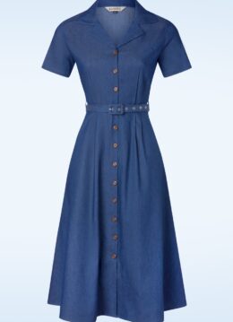 Dat een denim dress zowel fierce als classy kan zijn, bewijst deze Tallulah Swing Dress in Blue! Deze swing beauty heeft een puntige kraag, een reeks koperkleurige knopen op het lijfje waarvan de bovenste 3 functioneel zijn, flatterende korte mouwen en een matchende riem die je taille perfect benadrukt. Vanaf de taille waaiert ze uit in een vrouwelijke swing rok met handige zijwaartse steekzakken. Ze is uitgevoerd in een stevige en stretchy, donkerblauwe katoenmix waardoor ze heerlijk draagt en is afgewerkt met donkergeel stikwerk voor die authentieke touch. ”Life’s too short for compromises and bad fitting denim, so follow your own blue dream and order Tallulah quickly, you denim darling!” * Swing stijl * Kraagje * Knopenrij aan de voorzijde (bovenste 3 zijn functioneel) * Korte mouwen * Afneembare riem * Zijwaartse steekzakken * Authentiek geel stikwerk * Blinde rits achterzijde * Valt bij een lengte van 1.70 m over de knie