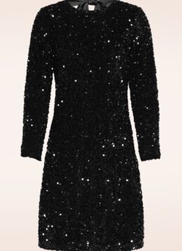 “Celebrate yourself, steal the spotlight.” Deze party-proof A-lijn jurk is uitgevoerd in een fluweelachtige, zwarte stof met een lichte stretch, bezaaid met pailletten en een strik aan de achterzijde. * A-lijn * Hoge, ronde halslijn * Zwart strikdetail achterzijde * Geen rits- of knoopsluiting; aantrekken en ‘ready to party’ * Volledig gevoerd * Reikt bij een lengte van 1,70 m tot net boven de knie