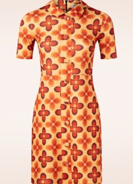 “Orange pop, brown drop and a print that won’t quit!” Deze a-lijn jurk is uitgevoerd in een prachtige soepele en stretchy, crêpe achtige geelbruine stof met een retro bloemenprint in oranje en bruintinten. * A-lijn * Peter Pan kraagje * Sierknopen * Korte mouwen * Blinde rits achterzijde * Exclusief bij Topvintage verkrijgbaar * Valt bij een lengte van 1.70 m boven de knie