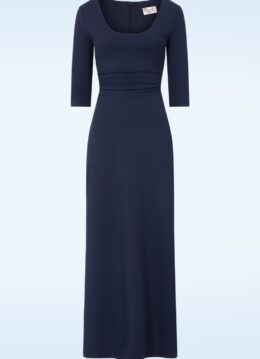 ”The kind of blue that leaves you breathless!” Deze maxi beauty heeft een diepe, ronde halslijn, 3/4 mouwen en loopt vanaf de taille uit in een maxi rok. Uitgevoerd in een soepele en stretchy, navyblauwe crêpe achtige stof die comfy is om te dragen. * Maxi jurk * Gevoerde top * Diepe, ronde hals * Geplooide taille * 3/4 mouwen * Blinde rits achterzijde * Exclusief bij Topvintage verkrijgbaar * Reikt bij een lengte van 1,70 m tot aan de enkel