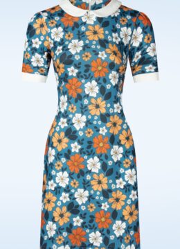 “Swinging sixties with a floral twist!” Deze korte A-lijn jurk ademt de vrolijke sfeer van de jaren 60. Ze heeft een schattig Peter Pan kraagje, korte pofmouwtjes en loopt uit in een speels A-lijntje. Uitgevoerd in een soepele, stretchy stof in tealblauw, voorzien van een retro bloemenprint in warme oranje- en geeltinten. Een echte feelgood dress die je look instant een vintage vibe geeft! * A-lijn model * Peter Pan kraag * Korte pofmouwen * Blinde rits achterzijde * Exclusief bij Topvintage verkrijgbaar * Valt bij een lengte van 1,70 m boven de knie