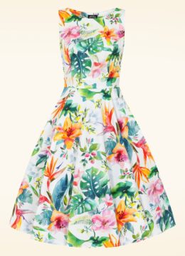 ”Flowers, the ultimate mood-lifter!” Talia is uitgevoerd in een stevige, maar soepel vallende, witte katoenmix met een kleurrijke tropische bloemenprint en voorzien van een lichte stretch voor een heerlijk draagcomfort. * Full swing * Hoge halslijn * Zijwaartse steekzakken * Combineer met een van onze petticoats voor een extra feestelijk effect * Blinde rits aan de zijkant * Valt bij een lengte van 1,70 m over de knie