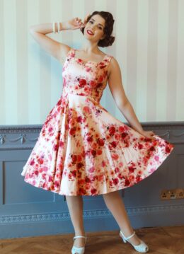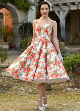 “My time to bloom!” De Gorgeous Scarlet Garden is buitengewoon elegant met haar hoge halslijn, vaste strikbandjes, korte mouwtjes en een volle, flowy swing rok. Ze is gemaakt van een stevige maar soepel vallende rode katoenmix met een kleurige bloemenprint, en heeft een lichte stretch voor ultiem draagcomfort. * Full swing * Hoge halslijn met vaste strikbandjes * Zijwaartse steekzakken * Blinde rits aan de achterzijde * Combineer met een van onze petticoats voor een extra feestelijk effect * Valt bij een lengte van 1,70 m over de knie