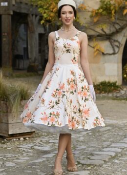 “Floral dreams in motion.” Deze prachtige swingjurk is gemaakt van een stevige, maar soepelvallende ivoorwitte katoenmix, versierd met een schitterende bloemenprint in blush en koraaltinten. Dankzij de lichte stretch draagt ze heerlijk comfortabel en beweegt de zwierige rok elegant mee bij elke stap, een echte must-have voor een speelse, zomerse look. * Full swing * Zijwaartse steekzakken * Blinde rits achterzijde * Combineer met een van onze petticoats voor een extra feestelijk effect * Valt bij een lengte van 1,70 m over de knie