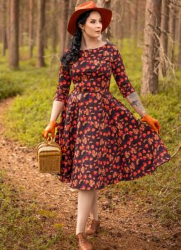 ”Fall-ing for you all over again!” Ga voor een kleurrijke look dit najaar met deze Adriana herfst swing jurk! Het aansluitende lijfje heeft een prachtige boothals, 3/4 mouwen en vanaf de taille loopt ze uit in een zwierige swing rok waardoor jij een super vrouwelijk silhouet krijgt. Uitgevoerd in een stevige maar soepel vallende, wijnrode katoenmix met een lichte stretch, voorzien van een geweldige print met egels en eekhoorntjes in verschillende oranje tinten. Ben jij al verliefd? 😉 * Full swing model * Boothals * 3/4 mouwen * Zijwaartse steekzakken * Combineer met een van onze petticoats voor een extra feestelijk effect * Blinde rits achterzijde * Exclusief bij Topvintage verkrijgbaar * Valt bij een lengte van 1.70 m over de knie