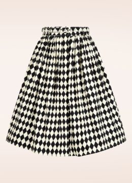 “Black, white, and full of delight.” Deze swing rok met knopen wordt hoger in de taille gedragen waardoor er een super vrouwelijk silhouet ontstaat. Ze is uitgevoerd in een soepel vallende, katoenmix met zwart/witte ruitjes en een hele lichte stretch. * Full swing rok * Zijwaartse steekzakjes * Knoop- en haaksluiting voorzijde * Riemlusjes * Afneembare matching riem * Kan gecombineerd worden met een van onze petticoats * Valt bij een lengte van 1,70 m over de knie