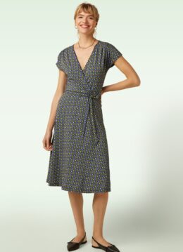 “Retro romance, wrapped to perfection.” Abigail Blend heeft een prachtige V-halslijn met vaste overslag en flatterende plooitjes, speelse kapmouwtjes en een afneembaar, bijpassend striklint om je taille mooi te accentueren. Ze is uitgevoerd in een zachte, soepele en stretchy biologische katoenmix met een kleurrijke retroprint die meteen in het oog springt. * A-lijn * V-hals met vaste overslag * Plooitjes * Korte kapmouwen * Afneembare matching striklintje * Géén ritssluiting of knopen * Valt over de knie bij een lengte van 1,70 m