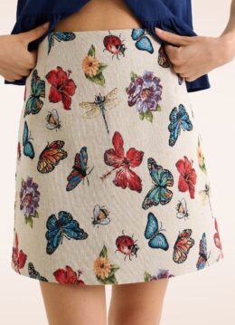 “Printed to play, tailored to slay… this jacquard mini does both.” Dit speelse A-lijn rokje is uitgevoerd in een iets dikkere en stevige jacquard stof (stretcht niet!) voorzien van een vlinder print. * A-lijn model * Zilverkleurige rits achterzijde * Volledig gevoerd * Valt bij een lengte van 1,70 m boven de knie