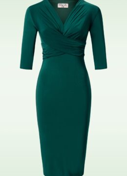 ”If in doubt, go green!” Deze curve hugging beauty heeft een v-halslijn, een vaste geplooide overslag top en is uitgevoerd in een stretchy en slinky, glanzend bosgroen stofje waardoor ze een genot is om te dragen. * Pencil * V-halslijn * Vaste geplooide overslag * 3/4 mouwen * Geheel gevoerd * Geen rits of knopen; aantrekken en ready to go! * Valt bij een lengte van 1,70 m over de knie
