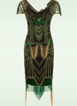 “Roaring ’20s vibes, modern sparkle… flapper fabulous in every step.” Deze hand bewerkte, party-proof jurk is een reproductie van de elegante flapper dresses uit de jaren 20! Uitgevoerd in een zwarte, semi-doorschijnende stof met een hele lichte stretch, voorzien van glimmende kraaltjes, studs en franjes in groen en goud. “Dazzle, sparkle, repeat!” * Aansluitend model * Handbewerkt * Onderjurkje * V-hals en rug * Geschulpte kapmouwtjes * Franjes * Geen rits of knopen; aantrekken en ready to party! * Valt bij een lengte van 1,70 m over de knie