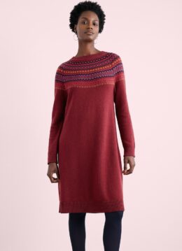 “Festive knits, cozy vibes.” Deze gebreide winterjurk is de perfecte mix van warm, vrolijk en onweerstaanbaar comfy! Ze heeft lange mouwen en een klassieke ronde halslijn die is versierd met een prachtig Noors breipatroon in contrasterende tinten. Ze is uitgevoerd in een fijngebreide, zachte organische katoenmix met een vleugje Merinowol, waardoor ze heerlijk warm, stretchy en comfortabel draagt.   * Hoge taille * Lange mouwen * Geen rits of knopen; aantrekken en ready to go! * Valt bij een lengte van 1,70 m tot over de kuit