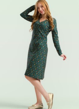 ”Letting the beauty of flowers brighten my day!” De Chrissy Cross jurk is een tijdloze must-have die dit seizoen niet mag ontbreken in je garderobe. Ze heeft een sierlijke vaste overslagtop, lange mouwen en loopt uit in een zwierig A-lijntje dat ieder figuur flatteert. Uitgevoerd in een soepele en stretchy organische katoenmix, voorzien van een speelse retro bloemenprint in prachtige herfsttinten.   * A-lijn * Vaste overslag * Lange mouwen * Geen rits of knopen; aantrekken en ready to go! * Valt bij een lengte van 1.70 m net over de knie