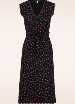 “Cute, comfy & blooming pretty.” Deze comfortabele midi-jurk in zwart met rode bloemetjesprint is pure vintage sweetness. Ze heeft een elegante V-halslijn met een geplooide buste, terwijl subtiele kanten biesjes een romantische, retro-geïnspireerde touch toevoegen. Gemaakt van een zachte, stretchy biologische katoenmix, een milieuvriendelijk alternatief dat extra fijn draagt. * Midi-jurk * V-halslijn * Geplooide buste * Kanten biesjes * Afneembaar striklint * Valt bij een lengte van 1,70 m tot op de kuit