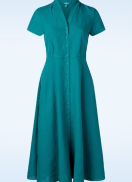 “Simply blue. Simply beautiful.” Deze prachtige midi-jurk in ijsvogelblauw is perfect voor het komende seizoen! Ze heeft een elegante V-halslijn met korte mouwen, een knopenreeks aan de voorzijde en loopt uit in een zwierige rok met handige steekzakken. Ze is uitgevoerd in zacht en ademend 100% linnen dat heerlijk draagt. * Midi jurk * V-halslijn * Korte mouwtjes * Knopenreeks * Voorzien van zakken * Valt bij een lengte van 1,70 m halverwege de kuit