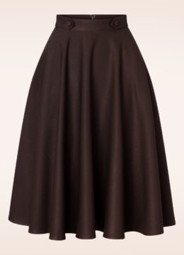”Swing your way into winter” met deze Di Di Swing Skirt in Brown! Dit fifties pareltje draag je hoog in de taille, vanwaar zij uitloopt in een klassieke, elegante swing rok. De ‘faux’ knoopdetails in de zij vormen niet alleen een speels detail, maar benadrukken je taille ook nog eens extra. Uitgevoerd in een stevige maar soepel vallende, donkerbruine stof (stretcht amper) die prachtig met je mee beweegt. De winterperiode kan zo mooi zijn, zeker met een rok als Di Di in je kast! 😉 * Full swing rok * ‘Faux’ knoopdetails * Zijwaartse steekzakken * Rits- en haaksluiting achterzijde * Combineer met een van onze petticoats voor een extra feestelijk effect * Valt bij een lengte van 1,70 m over de knie