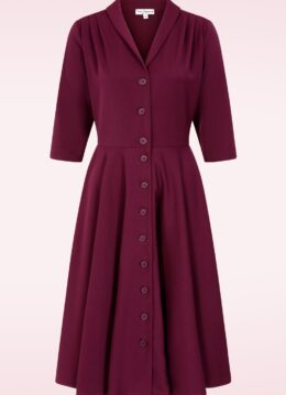 Deze D’Laine jurk is een vintage droom die uitkomt! Supervrouwelijk en elegant dankzij het kraagje, de reeks knopen en 3/4-mouwen. Vanaf de taille loopt ze uit in een zwierige, volle swingrok die een prachtig vrouwelijk silhouet creëert. Uitgevoerd in een stevige maar soepel vallende stofmix met een vleugje viscose, in een rijke bordeauxrode kleur met een fijne stretch voor heerlijk draagcomfort. Dromen zijn niet altijd bedrog! 😉 * Full swing model * V-halslijn * Afgeronde kraag * Reeks knopen * 3/4 mouwen * Kan gecombineerd worden met een van onze petticoats * Valt bij een lengte van 1,70 m over de knie