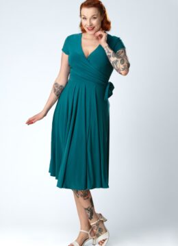 Deze Layla overslag jurk in teal is een echte vintage beauty die geschikt is voor iedere gelegenheid! De aansluitende top heeft een prachtige V-halslijn, mooie overslag, speelse strikbandjes die je zowel los als gestrikt kunt dragen en flatterende plooitjes in de zij. Vanaf de taille waaiert ze uit in een zwierige semi-swing rok. Ze is uitgevoerd in een glad en soepel, licht glanzend, stretchy teal gekleurd stofje. “Layla we’re in love!”   * Semi-swing stijl * Vaste gevoerde overslag * Korte kapmouwtjes * Vaste strikbandjes * Geen rits of knopen; aantrekken en ready to go * Valt over de knie bij een lengte van 1,70 m