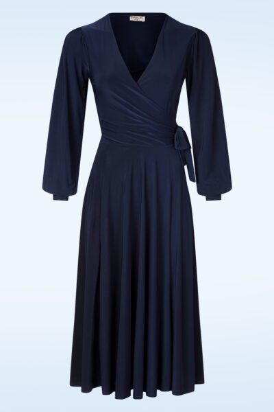 “Navy nights, effortless elegance!” Voel je vrouwelijk en zelfverzekerd in Athena! Ze heeft een flatterende taille, lange pofmouwen voor extra drama en elegantie, en loopt vanaf de taille subtiel uit in een zwierige semi-swing rok. Uitgevoerd in een soepel, licht glanzend slinky stofje dat heerlijk meebeweegt bij elke stap. Perfect voor een chique avondje uit of een stijlvolle daglook met een retro touch.   * Semi-swing stijl * V-hals met overslag * Gevoerde top (m.u.v. de mouwen) * Lange pofmouwen met manchetten * Vast strikdetail in de taille * Geen rits of knopen; aantrekken en ready to go! * Valt bij een lengte van 1,70 m ruim over de knie