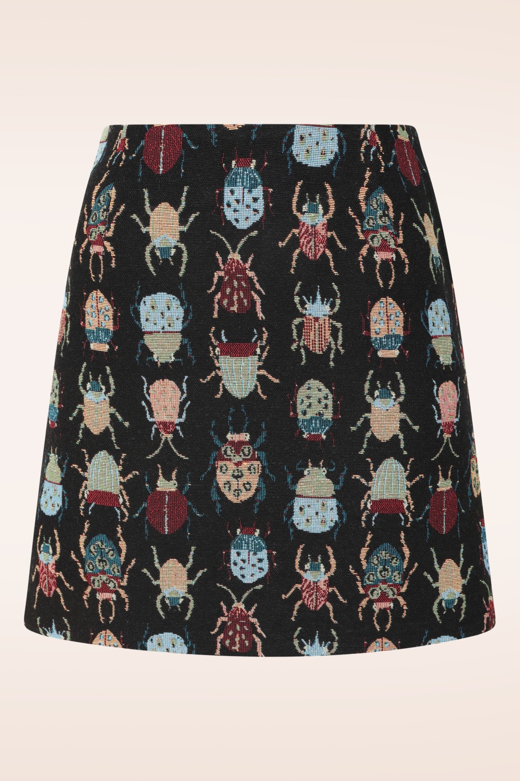 “Printed to play, tailored to slay… this jacquard mini does both.” Dit speelse A-lijn rokje is uitgevoerd in een iets dikkere en stevige jacquard stof (stretcht niet!) met een print van kleurrijke kevers.    * A-lijn model * Zilverkleurige rits achterzijde * Volledig gevoerd * Valt bij een lengte van 1,70 m boven de knie
