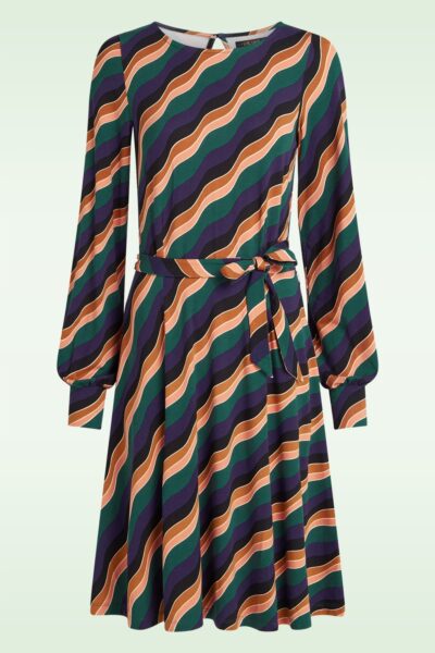 “Wear your groove, one stripe at a time!” Deze semi-swing beauty heeft een ronde halslijn, lange bisschopsmouwen en is uitgevoerd in een zachte, soepele en stretchy EcoVero viscosemix, voorzien van een seventies geïnspireerde print!  * Semi-swing model * Ronde halslijn * Lange bisschopsmouwen * Afneembaar striklint, voor een ‘snatched’ taille * Keyhole met knoopsluiting aan de achterzijde  * Valt bij een lengte van 1,70 m net over de knie