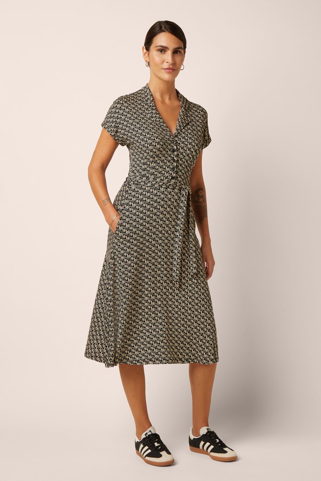 ”Speels, vrouwelijk en helemaal retro!” Ze is uitgevoerd in een heerlijk soepele en luchtige EcoVero viscosemix (stretcht niet!) met een prachtige geometrische retroprint in crème en zwart, die garant staat voor eindeloos draagplezier. What’s not to love?   * Midi jurk * Revers kraagje * Reeks knopen * Korte kapmouwen met omslagjes * Afneembare strikriem * It has pockets! * Valt bij een lengte van 1,70 m over de knie
