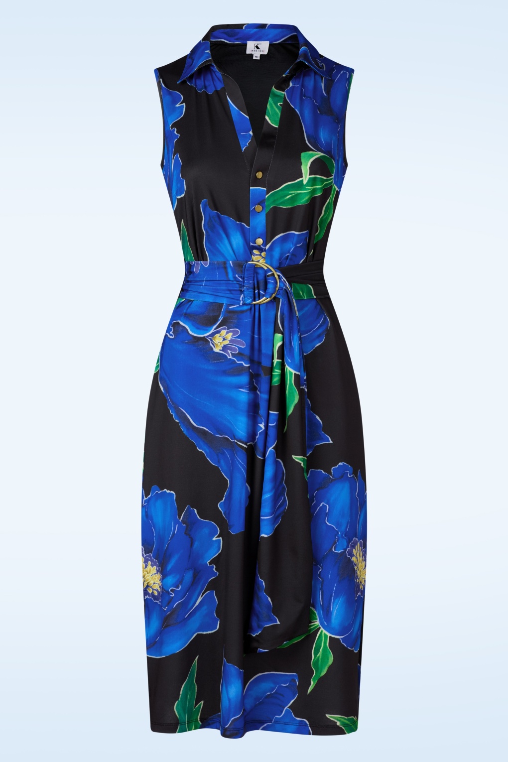 Home > Decade > 70s > Elena flower midi jurk in zwart en blauw