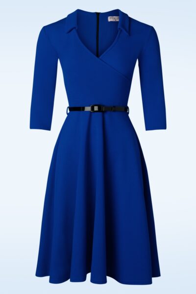 Iedere keer weer zal het een feestje zijn als je deze flirty Elena swing jurk draagt! Ze is uitgevoerd in een stretchy, soepel vallende en crêpe achtige koningsblauwe stof die heerlijk draagt.   * Swing model * Puntig kraagje * Vaste overslag top * 3/4 mouwen * Afneembaar lakriempje, voor een extra ‘snatched’ taille * Blinde rits achterzijde * Valt bij een lengte van 1,70 m net over de knie