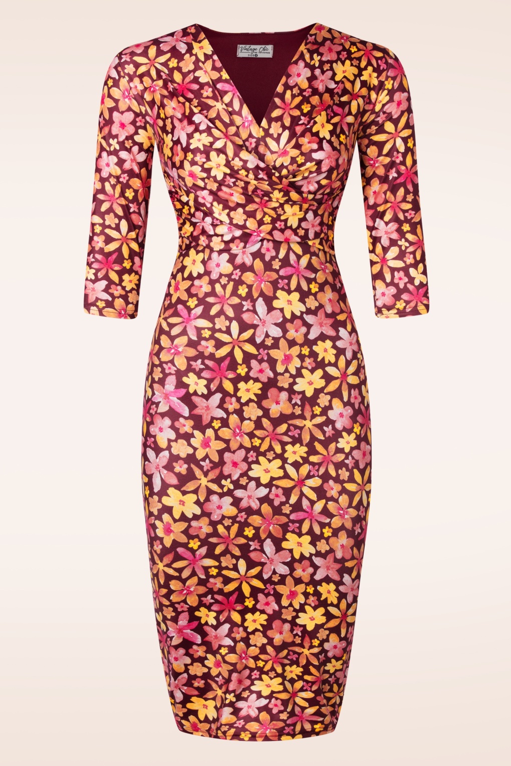 ”Life is better in Eliza!” De zomerse en curve hugging beauty heeft een v-halslijn, een vast geplooid overslag detail bij de buste en is uitgevoerd in een stretchy en slinky, glanzend wijnrood stofje met een vrolijke bloemenprint in geel en roze tinten.    * Pencil * V-halslijn * Vast geplooid overslag detail * 3/4 mouwen * Geheel gevoerd * Geen rits of knopen; aantrekken en ready to go! * Valt bij een lengte van 1,70 m net over de knie