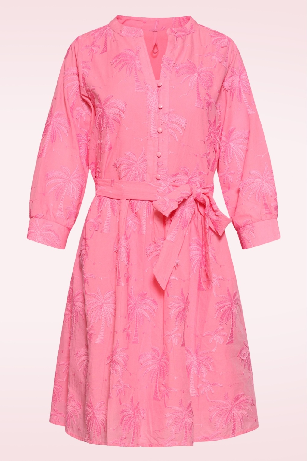 “Feeling palm-tastic today!” Deze roze a-lijn jurk is een frisse, zomerse must-have! Ze heeft een losse, comfortabele fit, 3/4 wijde pofmouwen en functionele knopen aan de voorzijde. De geborduurde palmbomen geven haar een speelse tropical twist en doordat ze is uitgevoerd in 100% katoen, draagt ze heerlijk luchtig en ademend.   * V-hals * Knopenreeks * Gevoerd * 3/4, wijde pofmouwen * Afneembaar striklint, voor een extra ‘snatched’ taille  * Valt bij een lengte van 1,70 m boven de knie