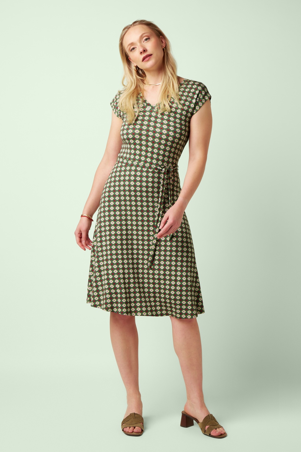 Als je nog geen last had van zomerkriebels, dan krijg je ze vanzelf van deze flowy beauty! Jade heeft een elegante V-halslijn én een verleidelijke V-rug, speelse kapmouwtjes en een smal, afneembaar stoffen striklintje dat je taille prachtig accentueert. Ze is uitgevoerd in een soepele en stretchy EcoVero viscosemix met een grafische print in vrolijke retro kleurtjes die heerlijk draagt. * Subtiele A-lijn  * Kapmouwtjes  * V-halslijn  * V-rug * Afneembaar stoffen striklintje * Geen rits of knopen; aantrekken en ready to go! * Valt bij een lengte van 1,70 m net over de knie
