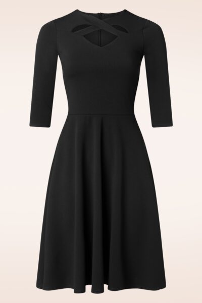 “Elegantly dark with just a flicker of the unusual; the perfect balance of seasonal and timeless.” Deze vintage geïnspireerde beauty heeft een opvallende semi sweetheart halslijn met een gekruist detail en is uitgevoerd in een stretchy zwart crêpe achtig stofje dat heerlijk draagt.    * Semi-swing model * Sweetheart halslijn met gekruist detail * 3/4 mouwen * Blinde rits achterzijde * Reikt bij een lengte van 1,70 m net over de knie