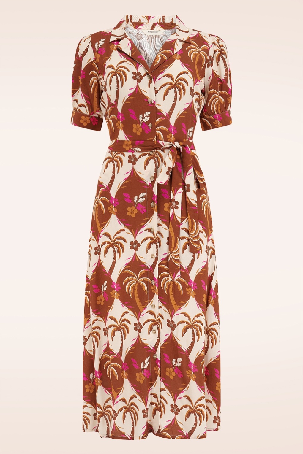 “Easy like a warm breeze through the palms.” Als de prachtige tropische bladerenprint in bruin met een vleugje roze je nog niet over de streep getrokken heeft, dan doet haar speelse midi snit dat wel. Penelope is licht getailleerd, heeft korte mouwen, een reeks knopen en is uitgevoerd in een stevige maar soepele, luchtige, non-stretchy crèmekleurige EcoVero viscose die heerlijk draagt.    * Midi shirt dress * Puntig kraagje * Korte, licht poffende mouwen met knoopsluiting * Afneembaar striklint * Knopen over de hele voorzijde * Zijwaartse steekzakken * Geen rits * Reikt tot halverwege de kuit bij een lengte van 1,70 m