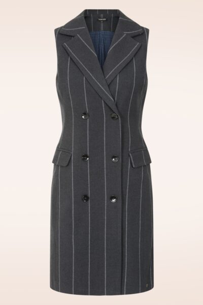 “Sharp lines, sleeveless finesse, endless style.” Dit veelzijdige, mouwloze blazer jurkje heeft een revers kraag, paspel zakjes en een dubbele knopenrij. Uitgevoerd in een iets dikkere, stevige donkergrijze stofmix (stretcht amper!) met een classy witte pinstripe.   * Revers kraag * Mouwloos * Dubbelde knopenreeks * Paspel zakjes voorzijde * Geheel gevoerd * Valt bij een lengte van 1,70 m boven de knie
