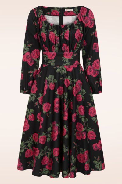 “A swing of roses, bold and unforgettable.” Deze swing jurk heeft een Carmen halslijn, lange mouwen en is uitgevoerd in een soepel vallende, zwarte katoenmix met een hele lichte stretch en een klassieke print van rode rozen. * Full swing jurk * Lange mouwen met elastiek * Zijwaartse steekzakjes * Rits- en haaksluiting achterzijde * Kan gecombineerd worden met een van onze petticoats * Valt bij een lengte van 1,70 m over de knie