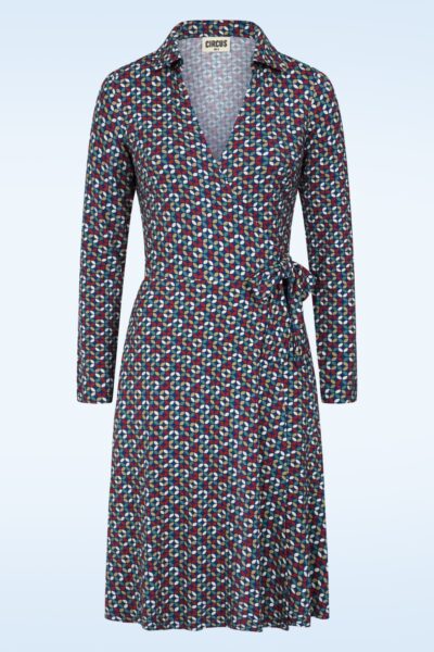 “Sustainably wrapped, boldly patterned, effortlessly chic.” Deze wikkeljurk heeft een kleurrijke, geometrische bloemenprint, lange mouwen, vaste strikbanden en handige steekzakken! Ze is uitgevoerd in een stretchy en soepel vallende, blauwe Ecolivamix (100% plantaardig materiaal), die heerlijk comfortabel draagt.  * Wikkeljurk * Puntige kraag * Lange mouwen * Vaste strikbanden * Voorzien van zakken! * Reikt bij een lengte van 1,70 m tot net over de knie