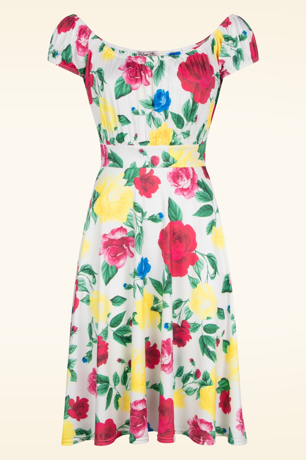 ”Vintage charm in full bloom!” De wonderschone Scarlet mag niet ontbreken in de garderobe van een vintage loving lady! Ze heeft een top met een geplooide buste, korte mouwtjes met elastiek die off shoulder gedragen kunnen worden en vanaf de taille loopt ze uit in een flowy swing rok, die je een prachtig silhouet geeft. Ze is uitgevoerd in een glad en soepel, licht glanzend en stretchy wit stofje met een kleurrijke rozenprint, dat garant staat voor veel kreukvrij draagplezier. Dus ook ideaal voor mee op reis! 😉   * Swing model * Geheel gevoerd * Mouwtjes die off shoulder gedragen kunnen worden * Geen rits of knopen; aantrekken en ready to go! * Valt bij een lengte van 1.70 m net over de knie