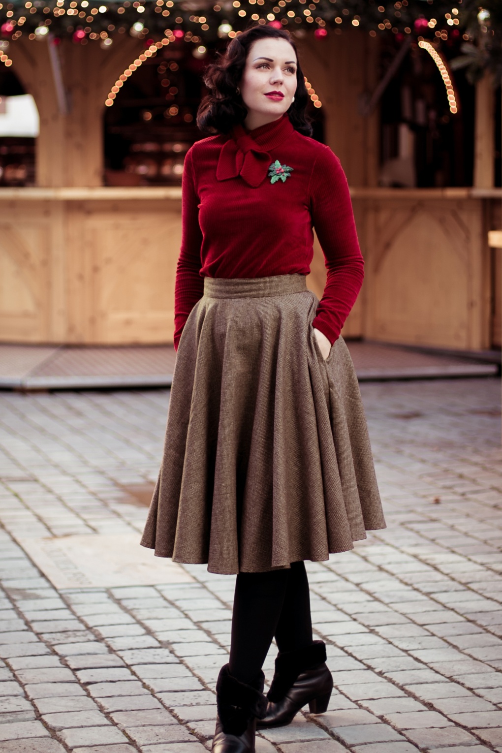 Swing your way into winter met deze Sophie rok! Dit fourties pareltje draag je hoog in de taille, vanwaar zij uitloopt in een klassieke, elegante swing rok. Uitgevoerd in een geweven, dikkere maar soepel vallende wolmix (stretcht niet!) met een klein classy ruitje in bruin en volledig gevoerd waardoor zij heerlijk draagt. De winterperiode kan zo mooi zijn, zeker met een rok als Sophie in je kast 😉 * Swing rok * Zijwaartse steekzakken * Rits- en knoopsluiting achterzijde * Volledig gevoerd * Valt over de knie bij een lengte van 1,70 m * Gedragen door gorgeous Madame Rhos