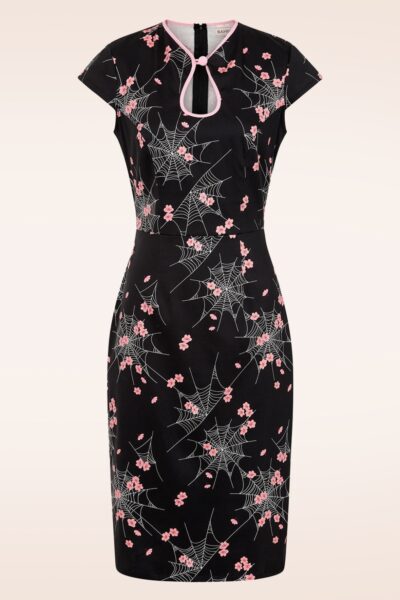 “Sweet blooms, wicked webs.” Deze aansluitende jurk is uitgevoerd in een stevige, zwarte katoenmix met een lichte stretch en een print van roze bloesem en witte spinnenwebben die heerlijk draagt.   * Aansluitend model * Korte kapmouwtjes * Keyhole detail met knoopje voorzijde * Rits- en haaksluiting achterzijde * Split achterzijde * Valt bij een lengte van 1,70 m net over de knie