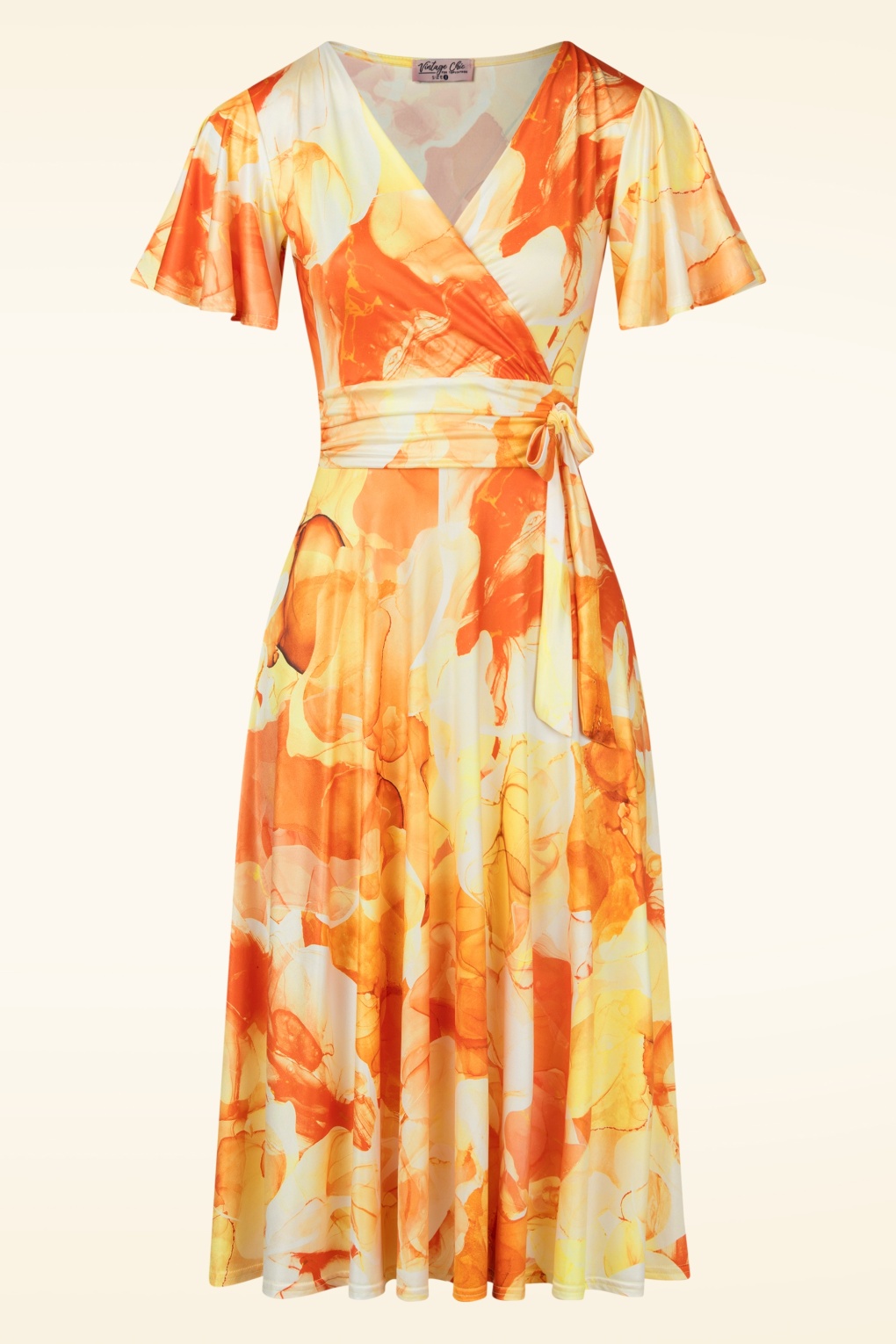 Home > Decade > 50s > Topvintage exclusive ~ Irene Aquarel Cross Over swing jurk in oranje en geel