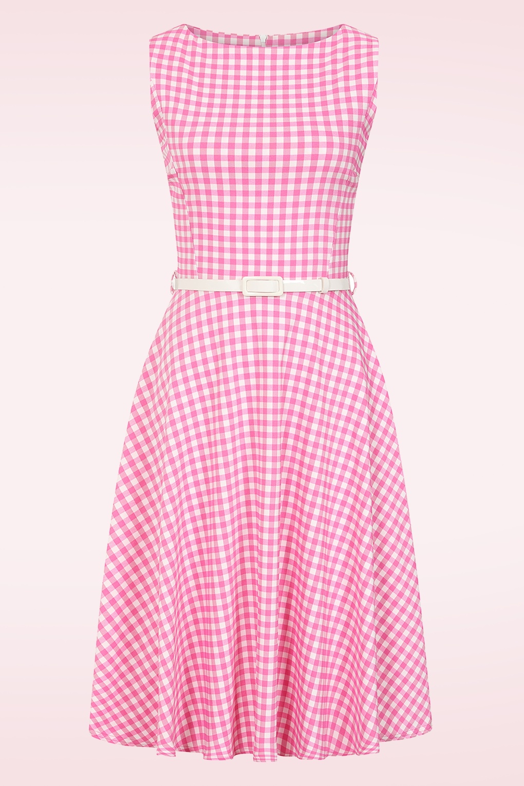 “Picnic-perfect charm.” Deze swing beauty is een echte klassieker met een speelse twist! De mouwloze top is gevoerd voor extra comfort en loopt vanaf de taille uit in een zwierige swingrok die bij elke stap elegant meebeweegt. Ze is uitgevoerd in een stevige maar soepele bengaline-achtige stofmix met een fijne stretch en een charmante ginghamprint in roze en wit. Voorzien van een blinde rits aan de achterzijde en een afneembaar lakriempje dat je taille extra mooi accentueert.   * Swing stijl * Boothals * Gevoerde top voor extra comfort * Mouwloos * Blinde rits achterzijde * Afneembaar lakriempje * Combineer met een van onze petticoats voor een extra feestelijk effect * Valt over de knie bij een lengte van 1,70 m * Exclusief bij Topvintage verkrijgbaar